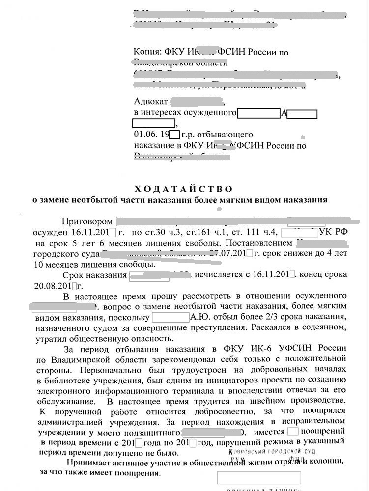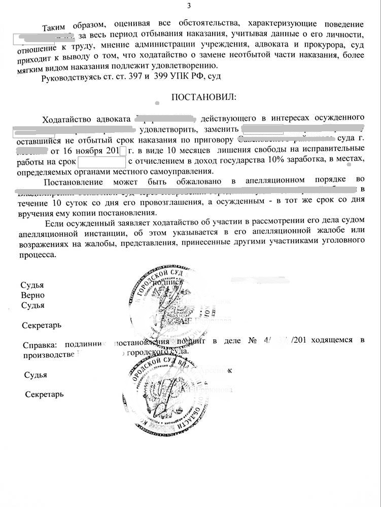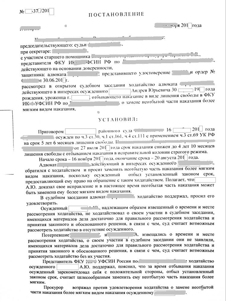 После подготовки адвокатом всех документов менее через два месяца мне удалось убедить суд и заменить неотбытую часть наказание более мягким видом наказания - исправительными работами.